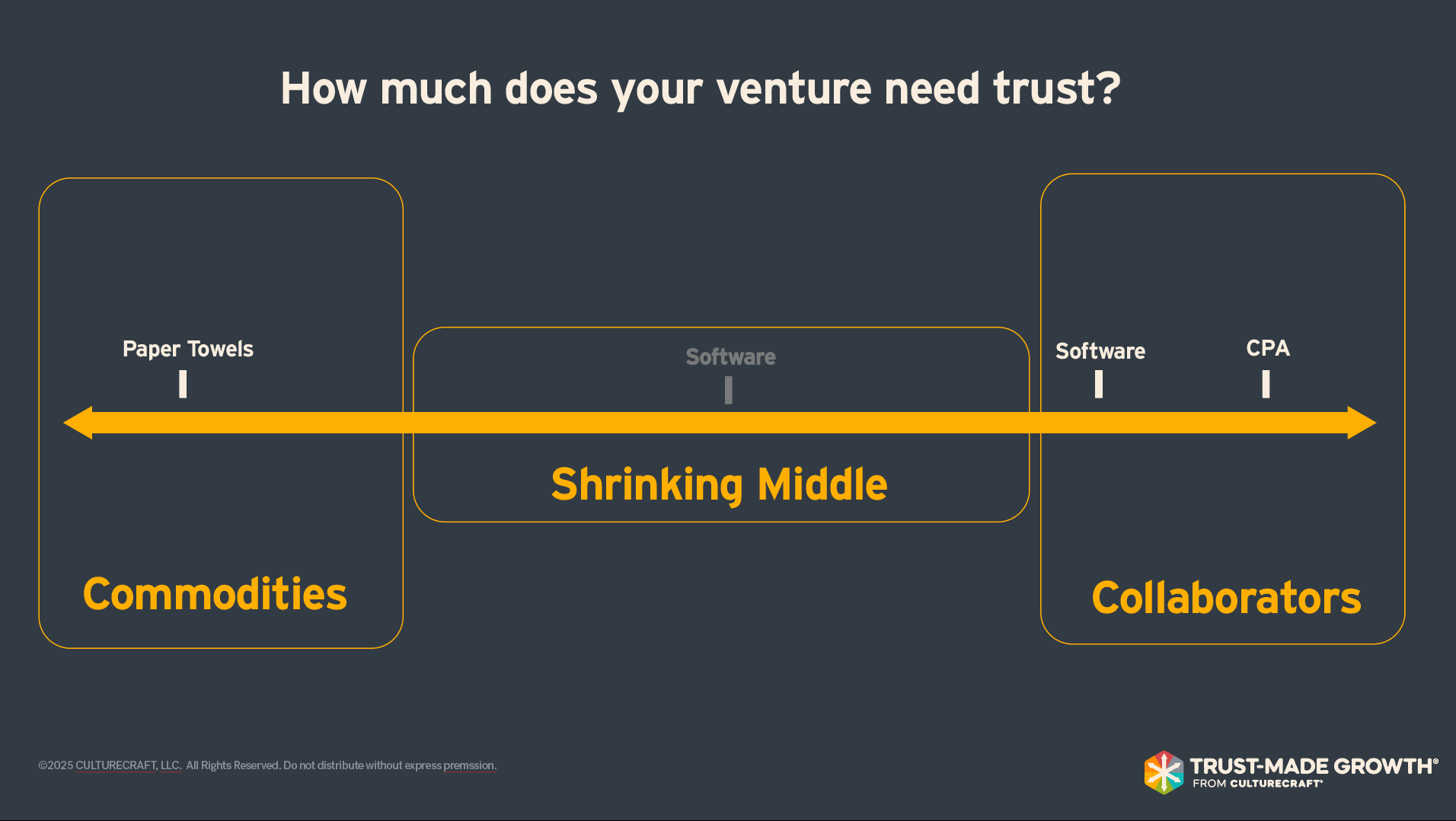 On the right side: collaborators. Custodians. These are the offerings that, if they disappeared tomorrow, a part of who you are or how you function would actually suffer. Your CPA. Your business coach. Your CRM. The person who holds something important for you. These relationships are built over long lead times, carry deep relational equity, and command genuine premiums—because you’re not paying for a product, you’re paying for the risk mitigation of having someone or something trustworthy in your corner.