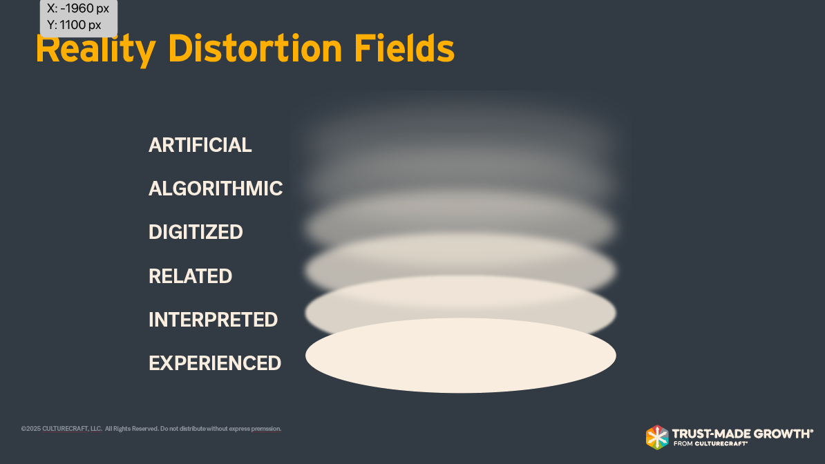 I used to train on that old famous communication framework: Sender message, Interference, Receiver understanding, to help salespeople understand that there's a layer of noise between them and the person they're talking to. Today, that "Noise" is seven layers deep, moving through six different distortions: