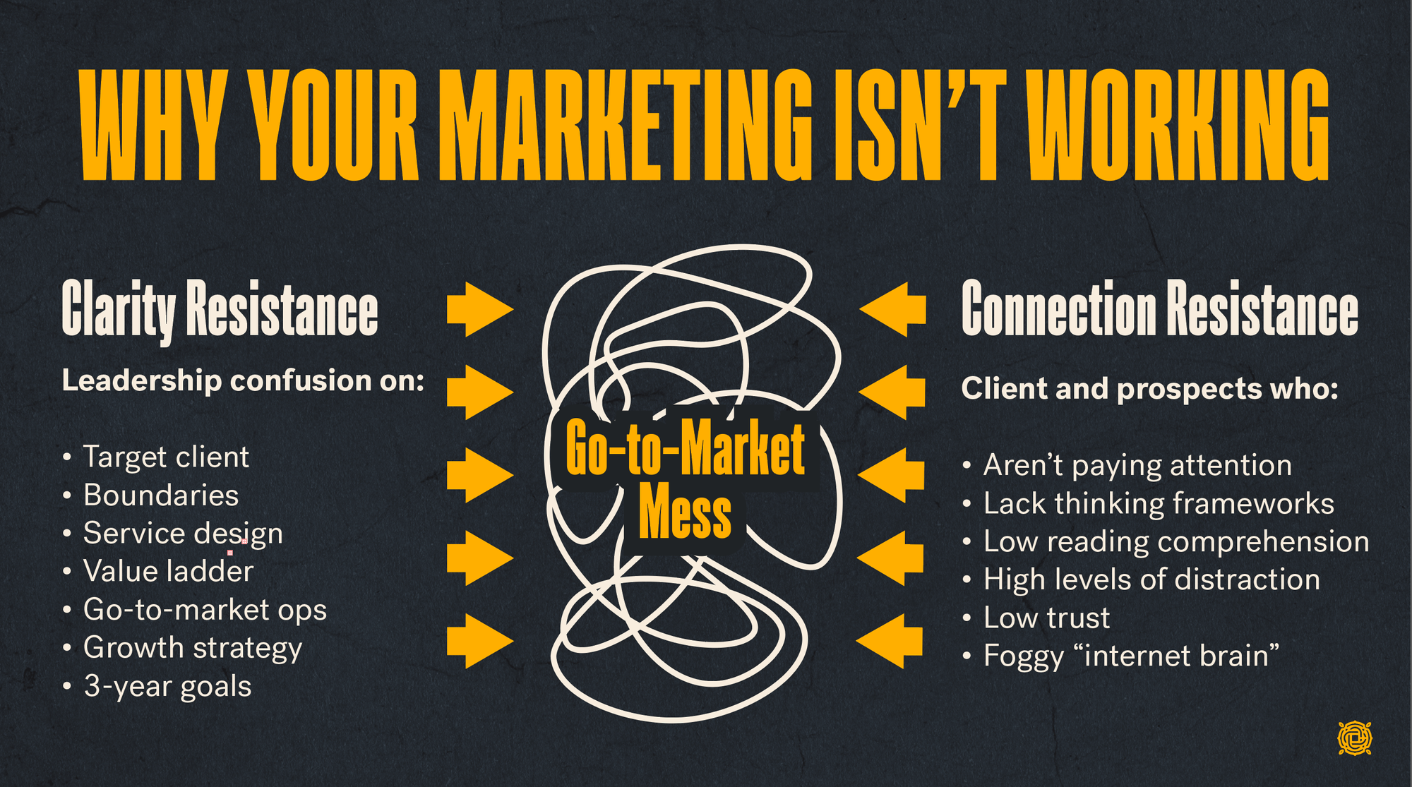 Simply, you can't make all the decisions your go-to-market needs all at once. You've got to prioritize the exact log jams that are keeping your growth stalled and your teams frustrated. They maybe asking you for a new website, but the problem is almost assuredly something else.