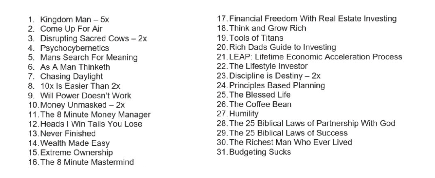 You should have a book plan this year. Even if it's audiobooks while you're on the elliptical, you need a plan. If that plan only includes war history books, self-help retreads of Think and Grow Rich, and members of the Simon Sinek cartel, you've got to expand. I give a few examples in my 2023 Good List. In contrast, here is a bad booklist. Don't let yours look like this in 2024 (taken from a very try-hard character on LinkedIn):