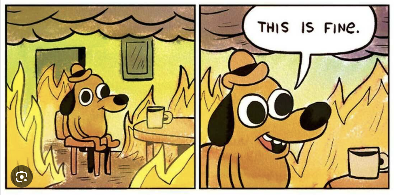 The lessons here are too many to count. But I'll tell you what I hope: Earned optimism (the non-toxic kind) is coming back in vogue. We'll know for sure when the "This is Fine" guy takes six months off for personal wellness and reflection.