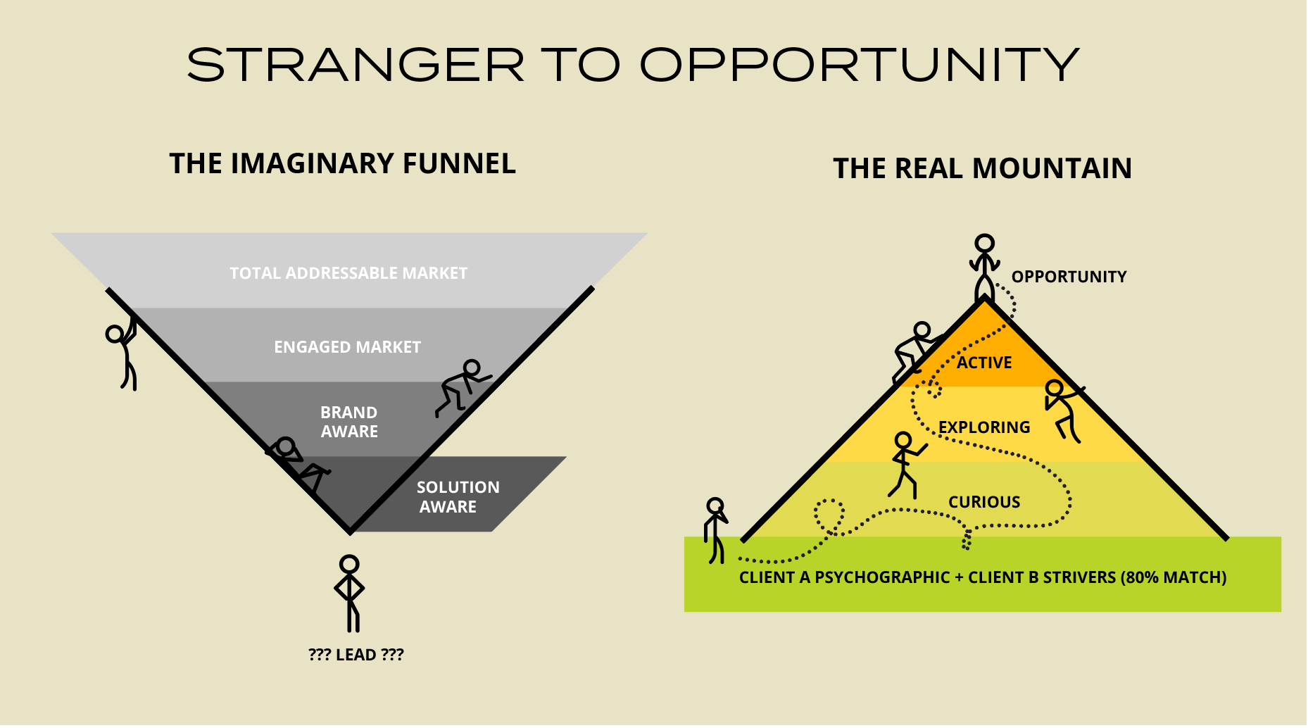 - Exchange your funnel for a mountain. You've been led to believe that you build a giant funnel where thousands of people slip in and then they slide down a greased slope into the hands of your loving sales team who can then cherry pick and close on the right people for you. You keep paying people to build that funnel. It doesn't work because that's not how people work. People buy stuff that matters to them not by accidently sliding their way into a sales call, but by climbing the mountain of trust.
