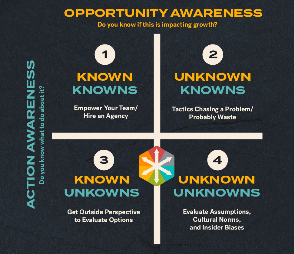 Today, the majority of growth opportunities are in the blind spot: The Unknown Unknowns—the place where what I call Insider's Dilemma rules. As an insider, you don't see the furniture, the wall color, or the patterns formed when you were half the firm you are today, which define reality. That (very normal) blindness that happens the longer you are inside and the more authority you have, is the driving reality in hindering organic growth at RIAs. And we see it over and over again.