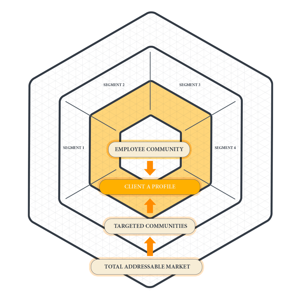 Growth ventures must first shift from demographic customer profiles to "communities.” People exist in networks of relationships, and recent research shows that over 60% of buying decisions happen within those networks. To own your market, you have to get laser-focused on that community first, a community we call Client A.