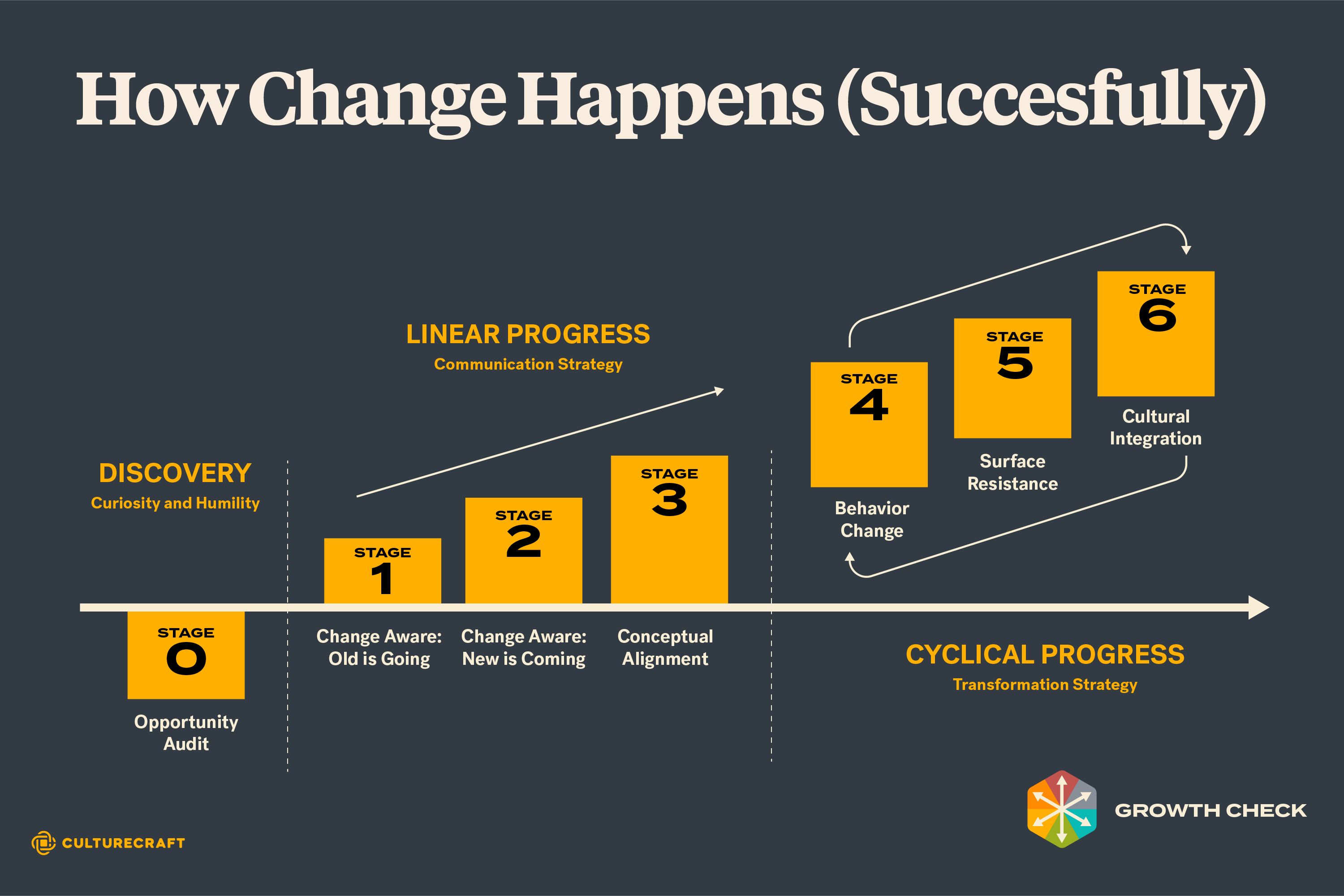 Stage 6: Cultural Integration: In the game of change, what we really want is a new normal. That new normal requires an upgraded culture: habits, language, priorities, behaviors. Culture doesn’t change in leaps, so you’ll get some early Stage 6 success and then need to cycle back to Stage 4 and repeat over and over until the culture (not the words or the ideas) behaves on its own the way you want it to without ongoing pressure.
